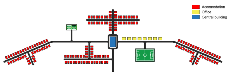 A shop and canteen can be located in the central building, Large meetings can also be held there. There are office buildings for IT and Logistics. And for the relaxation of the staff there is a soccer field and some tennis courts.