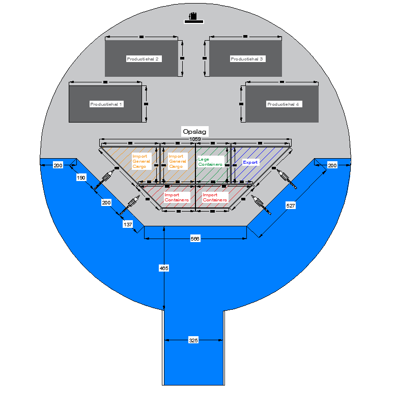 The entire port has a round shape. The quay is on the north side. There are 4 production halls, a storage and four cranes on the quay. The harbor entrance is 325 meters wide and has pouring stone on both sides.