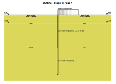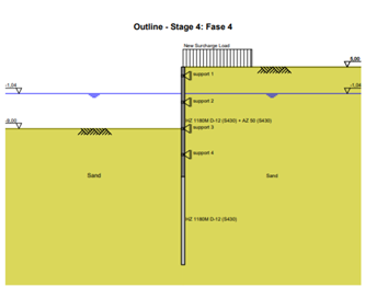 In phase 1 a load is applied tot the island side. This concerns the craned and other equipment for the realization of the pile and the sheet pile. The waterlevel is positioned at -1,04m NAP. The piles and the sheet pile will be installed in this phase. The calculation can be found in Annex X. In this phase there is relatively little distortion and moment present because the structure is the same for both sides. The only change is the 10kN/m upper weight on the island side. A visual representations can been seen in Figure 2: Phase 1.