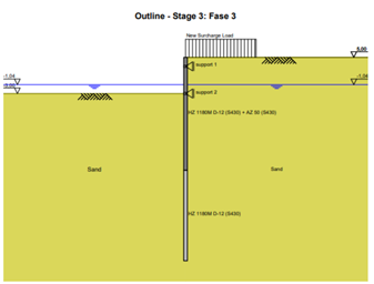 The combi wall is installed in pase 2. Now 2m is being excavated. The ground level on the water side is +3m NAP. A grout anchor is applied here. A visual representations can been seen in Figure 1: Phase 2.